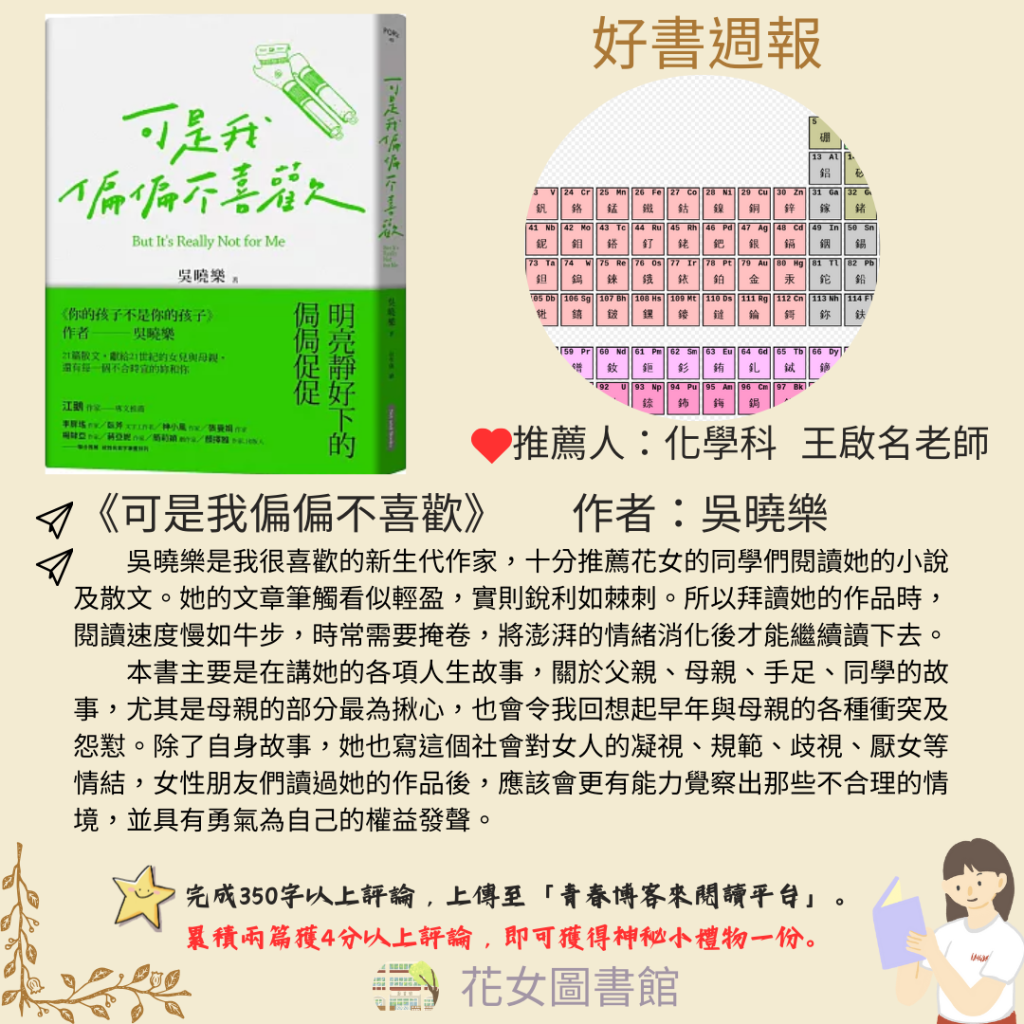 好書週報3/3-3/9Post author:圖書館主任Post published:2025-03-03Post category:圖書館 / 圖書館公告訊息 / 最新 / 最新消息 / 校園最新消息-一般文章 Post Views: 130相關內容轉知-文化部修正「辦理文化資產保存法第15條文化資產價值評估作業原則」行政指導文件一案2025-08-252022獨立研究成果展2022-04-26轉知-文化部公告「國定芝山岩考古遺址」公告資料一案2025-06-10