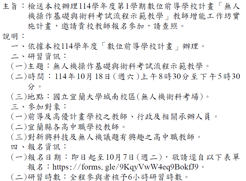 轉知-無人機操作基礎與術科考試流程示範教學Post author:秘書Post published:2025-09-24Post category:教師進修請有興趣參加教師擬以公假處理。1018下載1018附件下載 Post Views: 17相關內容【轉知】「光劍科普營」,請教師踴躍報名參加。2024-10-21物理學科中心辦理「2023中學教師物理探究暨演示實驗研習會-熱與能量的教學與演示之探究」實施計畫2023-11-23「112-2研究教師公開授課」實施計劃2024-03-01