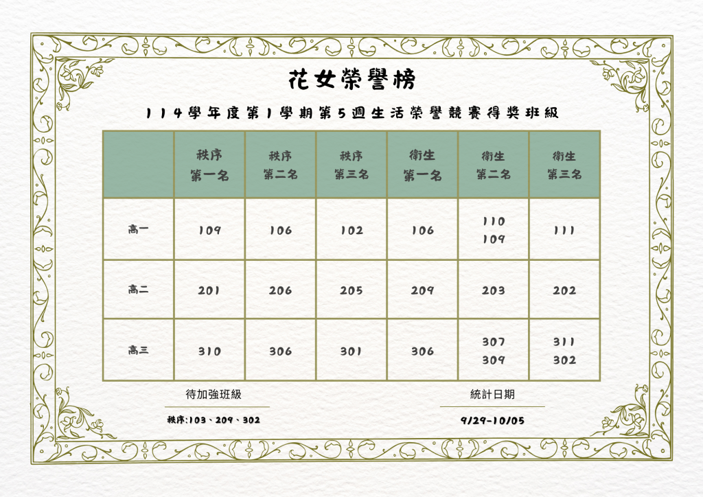 114學年度第1學期第5週生活榮譽競賽得獎班級Post author:生輔組長Post published:2025-10-07Post category:師生榮耀統計日期:9/29-10/05段考加油!! Post Views: 109相關內容【賀】本校參加第62屆東區科展表現亮眼2022-05-04113學年度第2學期第17週生活榮譽競賽得獎班級2025-06-10113學年度第1學期第12週生活榮譽競賽得獎班級2024-11-19