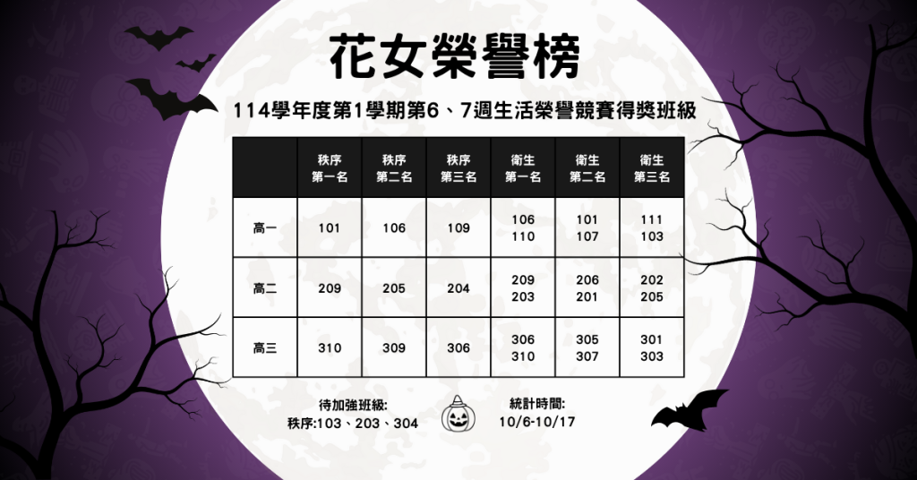 114學年度第1學期第6、7週生活榮譽競賽得獎班級Post author:生輔組長Post published:2025-10-21Post category:師生榮耀統計日期:10/7-10/17 Post Views: 113相關內容112學年度人權議題創作競賽成績公告2024-05-21112學年度第1學期第2週生活榮譽競賽2023-09-12114學年度第1學期第3週生活榮譽競賽得獎班級2025-09-24