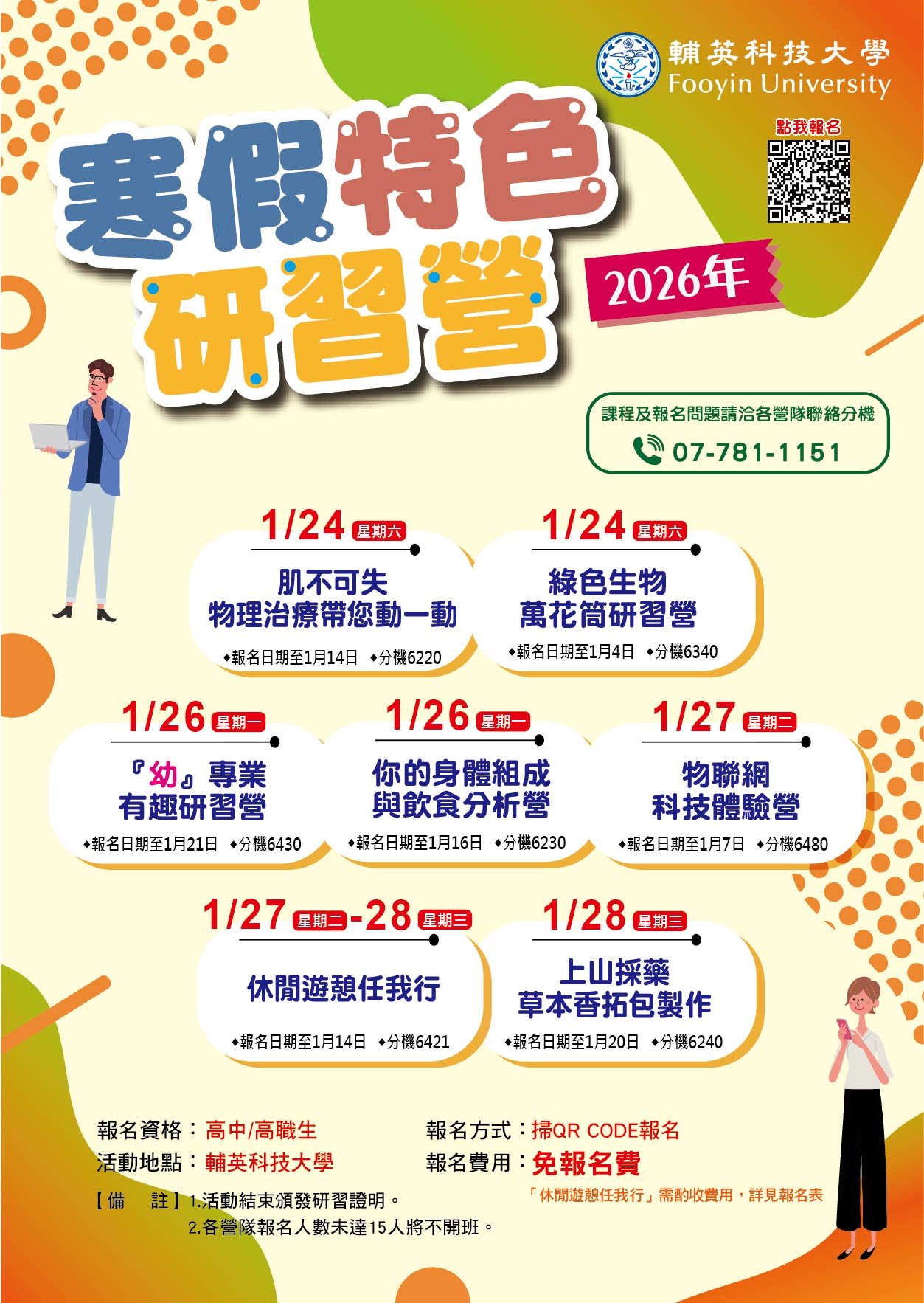 各類型競賽、研習、營隊等活動,詳如附件,請參閱。 (114.11.14)Post author:hlgshlc020Post published:2025-11-14Post category:校外活動國立新竹科學園區實驗高中26NEMUN模擬聯合國會議下載國立新竹科學園區實驗高中26NEMUN模擬聯合國會議2下載輔英科大-2026特色研習營2下載輔英科技大學2026寒假特色研習營下載花蓮縣文化局太平洋左岸藝術季-Uni優尼克當代馬戲團下載花蓮縣文化局太平洋左岸藝術季-Uni優尼克當代馬戲團2下載大葉大學-全國高中職Z世代設計獎AI短影音比賽下載大葉大學-葉總繪盃全國高中職電腦繪圖競賽之電繪之王下載臺北城市科大凱基證卷∞北城企管全國股王股后爭霸賽下載國立政治大學全國人文社會永續行動創新應用競賽下載亞洲大學職能治療學系寒假營隊下載伊甸社會福利基金會伊甸服務學習寒假-營隊-1伊甸社會福利基金會伊甸服務學習寒假-營隊2-1下載伊甸社會福利基金會伊甸服務學習寒假-營隊3下載伊甸社會福利基金會伊甸服務學習寒假-營隊4下載 Post Views: 50相關內容「2024第35屆AERC亞洲機器人運動競技大賽-無人機足球賽」,敬請師生踴躍報名參加。2024-10-11「第六屆衛星科學工作坊暨臺灣太空科學聯盟年會(及學生日)」,敬請踴躍報名參加。2024-11-11轉知-台北醫學大學「2025醫學英文暑期海外學習計畫系列課程」暫緩辦理說明2025-07-04