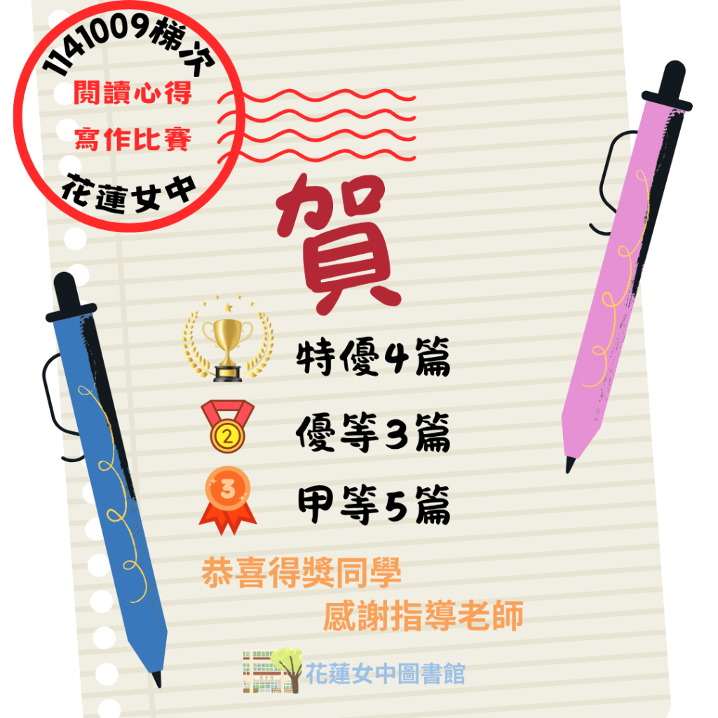 第1141009梯次閱讀心得寫作比賽獲獎名單Post author:圖書館主任Post published:2025-11-17Post category:全國閱讀心得比賽專區 / 圖書館 / 圖書館公告訊息 / 最新消息 / 校園最新消息-置頂文章第1141009梯次閱讀心得寫作比賽獲獎名單下載 Post Views: 145相關內容國立公共資訊圖書館辦理「以動物為食」系列講座暨書展2024-12-11第1101015梯次全國高級中等學校小論文寫作比賽 得獎作品一覽表2021-11-29轉知:文化部2025年第1屆臺灣國際兒少書展「師生結伴行,一同逛書展」2025-05-14