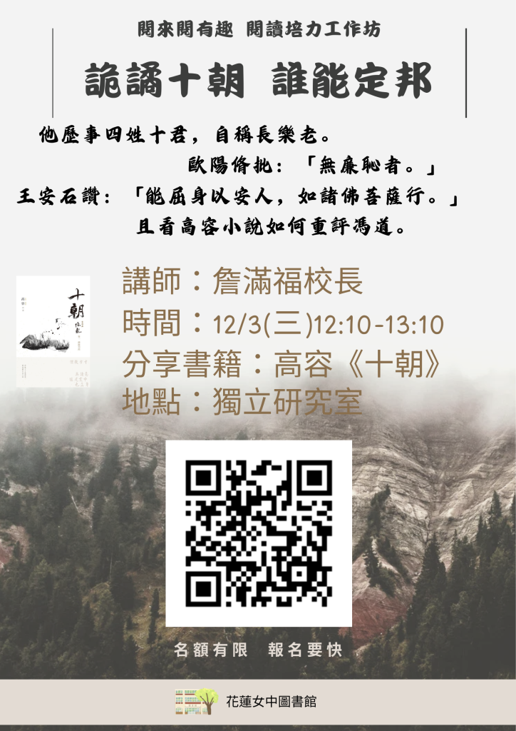 【公告】閱讀培力工作坊-4 開始報名Post author:圖書館主任Post published:2025-11-17Post category:圖書館 / 圖書館公告訊息 / 最新消息 / 校內活動閱讀培力工作坊第4場來囉!時間:12/3(三)12:10-13:10講師:詹O福校長地點:獨立研究室報名網址:https://forms.gle/aAFHM54VL5AjB8um9報名截止:11/28(五) Post Views: 17相關內容欣閱花女–10月共讀推薦2025-10-02全國高級中學閱讀心得寫作 第1101010梯次 得獎作品 2021-11-17轉知:擴大電子書計次借閱服務2024-12-09
