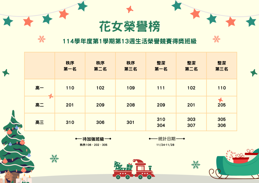 114學年度第1學期第13週生活榮譽競賽得獎班級Post author:生輔組長Post published:2025-12-02Post category:師生榮耀統計日期:11/24-11/28 Post Views: 8相關內容第十週生活榮譽競賽成績2021-11-08111學年度第2學期友善校園週文藝競賽得獎名單2023-03-24狂賀!狂賀!本校同學參加113學年度全國學生音樂比賽成績優異🏆2025-03-31