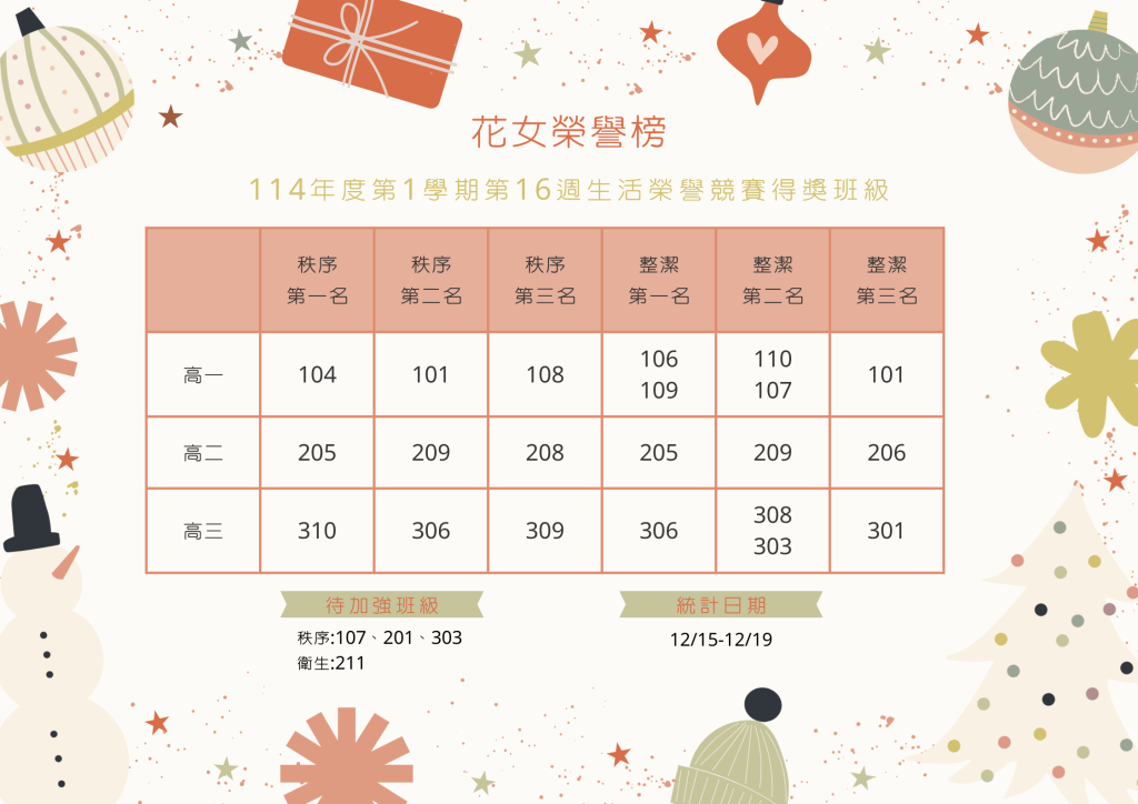114學年度第1學期第16週生活榮譽競賽得獎班級Post author:生輔組長Post published:2025-12-22Post category:師生榮耀 Post Views: 59相關內容112學年度第1學期第19週生活榮譽競賽得獎班級2024-01-09第十八週生活榮譽競賽成績2022-01-03113學年度第1學期第18週生活榮譽競賽得獎班級2024-12-31
