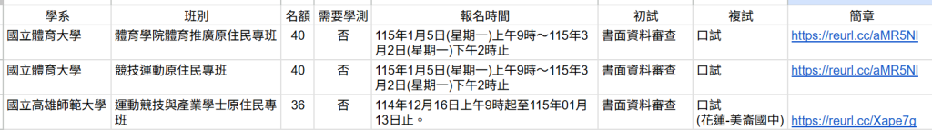 【獨招】115 學年 體育相關科系原住民專班Post author:體育組長Post published:2025-12-25Post category:升學進路 / 體育組/115學年度有國立體育大學,以及國立高雄師範大學提供運動相關科系原住民專班員額,符合資格也有興趣的同學可多加可慮。115學年體育相關科系原住民專班彙整-Google-試算表下載 Post Views: 17相關內容111學年度第1學期高三課程說明與團體諮詢簡報2022-10-31陽明交大與國防大學雙學位111年招生資訊2022-01-19【獨招】高師大原住民專班111年招生資訊2021-12-10
