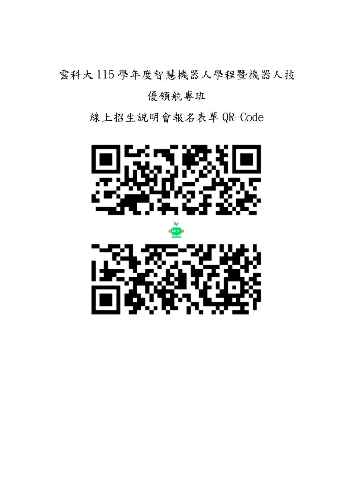 轉知:國立雲林科技大學-智慧機器人學士學位學程暨機器人技優領航專班「115學年度線上招生說明會」資訊Post author:輔導助理Post published:2025-12-29Post category:校外活動 / 輔導室招生說明下載※輔導室僅協助公告週知,並無代辦報名或宣傳業務。請有興趣師生、家長自行依主辦單位規定參加。 Post Views: 12相關內容【轉知】114學年度高級中等學校以縣(市)為夥伴學習群東部地區物理教師專業成長研習,惠請自然領域教師踴躍出席。2025-12-31文化部113年青年文化禮金使用期限將屆2024-11-25政治大學舉辦「2021年包種茶」學系博覽會活動,歡迎本校師生參加。2021-10-07