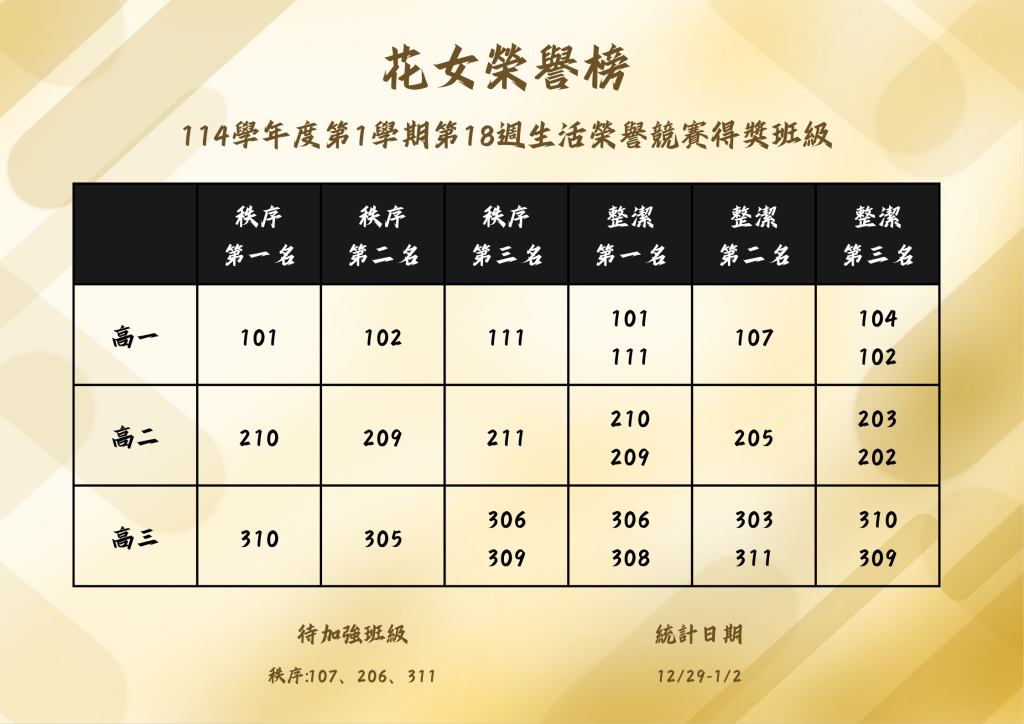 114學年度第1學期第18週生活榮譽競賽得獎班級Post author:生輔組長Post published:2026-01-06Post category:師生榮耀 Post Views: 165相關內容第八、九週生活榮譽競賽成績2023-04-17113學年度第2學期第5週生活榮譽競賽得獎班級2025-03-182022.05.05 東區科展2特優 花女進軍全國決賽2022-05-05