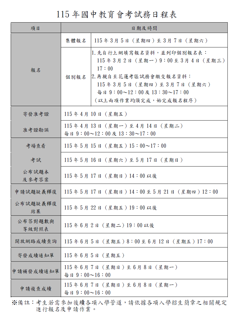 花蓮考區115年國中教育會考簡章公告Post author:註冊組長Post published:2026-01-09Post category:國中教育會考 / 無115年國中教育會考重要試務日程表花蓮考區115年國中教育會考簡章「花蓮考區115年國中教育會考簡章」電子檔如附檔,可免費下載使用。如需紙本簡章,請至國立花蓮女中教務處購買,每份15元。個別報名考生,請詳閱簡章報名方式及時程;如有問題請洽詢花蓮女中教務處 (03)8321202#122。(1)115.03.02~115.03.04下午 5 時前:先上網填寫報名資料及列印報名表。(2)115.03.05~115.03.07下午 5 時前:親自至國立花蓮女中教務處繳交報名資料。花蓮考區115年國中教育會考簡章_核定版下載 Post Views: 204相關內容自主學習資源2023-10-25112學年體育競賽榮譽榜2024-10-281232024-08-01