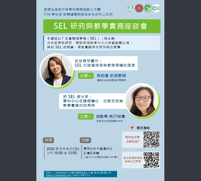 轉知-普通型高級中等學校課程推動工作圈114學年度新興議題與教育新知系列工作坊實施計畫與海報Post author:教學組組員Post published:2026-02-11Post category:教務處 / 教師進修來文-2026-02-11T093130.797下載1151003730-0-0下載 Post Views: 24相關內容【轉知】「114學年度高級中等學校海洋教育議題融入課程及 教學推動計畫」,請教師報名參加。2025-09-04社團法人慧治教育協會辦理【收穫經驗,累積成長|學習歷程檔案分享會】2026-01-15【轉知】113學年度綜合活動領域跨科主題課程-後疫情時代的關係議題:青少年生命韌力之探究:青少年生命韌力微課程成果發表會2024-09-04