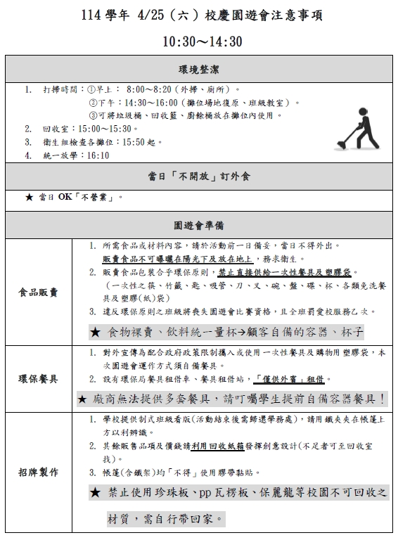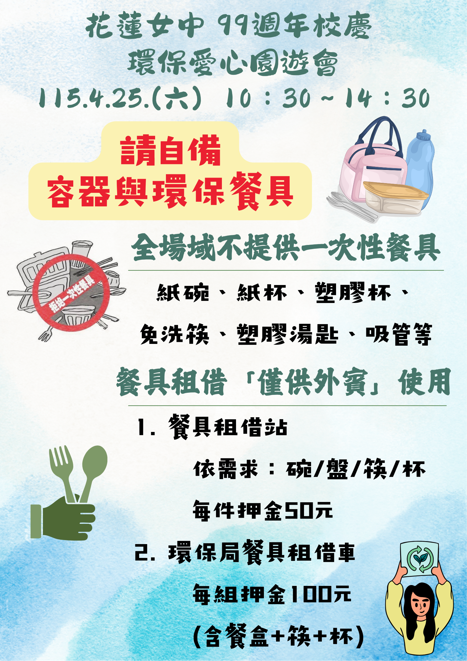 | 3 | 環保愛心園遊會 (購買時,請自備環保餐具) | 4/25(六)10:30-14:30 | 學務處 | 運動場 10:20開放自由入校 |