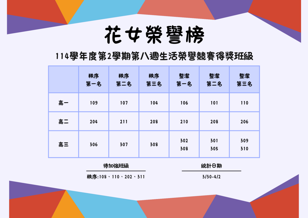 114學年度第2學期第8週生活榮譽競賽得獎班級Post author:hlgshlc050Post published:2026-04-08Post category:師生榮耀 Post Views: 90相關內容112學年度第1學期第13週生活榮譽競賽得獎班級2023-11-30第1101015梯次全國高級中等學校小論文寫作比賽 得獎作品一覽表2021-11-29第十七週生活榮譽競賽成績2023-06-13