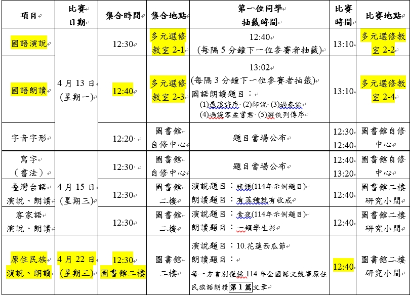 一、公告本校114學年度第2學期國語文競賽參賽學生名單-公告版以及修改競賽時間、地點一覽表,如名單中名字有誤請在4/10(五)放學前至教務處教學組更正。報名已截止,不接受取消、更正報名項目或新增報名。