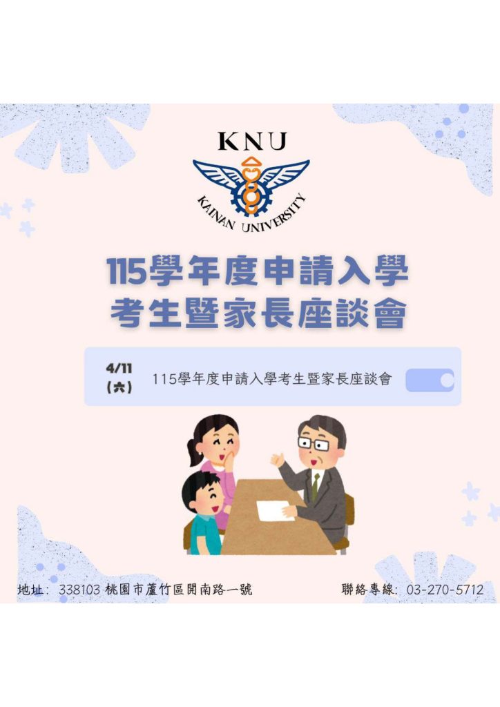 轉知:開南大學「115學年度大學申請入學考生及家長說明會」活動Post author:輔導助理Post published:2026-04-10Post category:輔導室※輔導室僅協助公告週知,並無代辦報名或宣傳業務。請有興趣師生、家長自行依主辦單位規定報名參加,建議欲參加同學先與家長討論,再報名前往參加。 Post Views: 15相關內容【重要】全校親職教育座談會之場地變動與其他相關細節。2021-10-28桃園國際機場股份有限公司「112年新進從業人員招募甄選」2023-04-21單國璽基金會辦理「2022生命探索營」活動2022-08-08