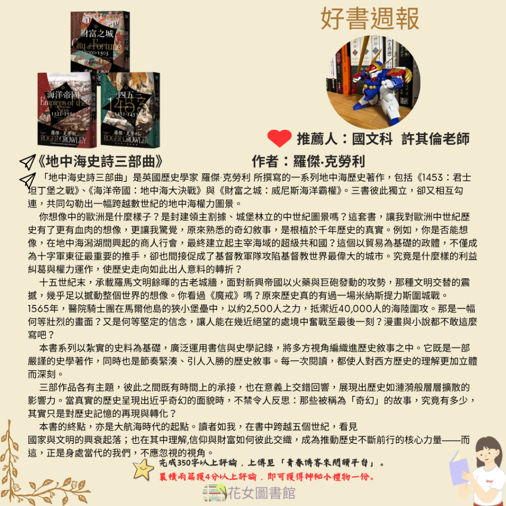 好書週報4/13-4/19Post author:圖書館主任Post published:2026-04-13Post category:圖書館 / 圖書館公告訊息 / 最新 / 最新消息 / 校園最新消息-一般文章 Post Views: 28相關內容轉知: 國家圖書館 2025年夏季閱讀講座:人生實難,大道多歧──從文學閱讀生命智慧2025-04-24花蓮縣文化局辦理「113年公共圖書館資源整合發展計畫-越讀者聯盟-青少年讀書會」活動(7月-9月)2024-06-14114學年度全國高級中等學校閱讀心得寫作比賽實施計畫2025-08-21