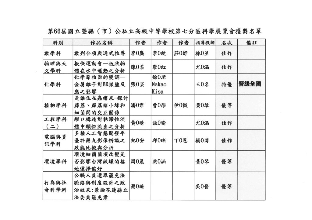 狂賀!!本校參加第66屆東區科展成績優異,榮獲1組特優(晉級全國)、3組優等、4組佳作。🏆Post author:設備組員Post published:2026-04-28Post category:師生榮耀 / 教務處 / 校園最新消息-置頂文章 / 科學競賽 / 設備組恭喜各位獲獎同學,也謝謝各位指導老師。 Post Views: 86相關內容114年全國技藝競賽「平面設計」選手培訓營,敬請學生踴躍參與。2025-09-22狂賀!狂賀!本校113年【花蓮市長盃】心算/聽心算/數學 競賽成績優異。2025-01-13「雙週一題網路數學問題徵答」,敬請學生踴躍報名參加。2026-02-26